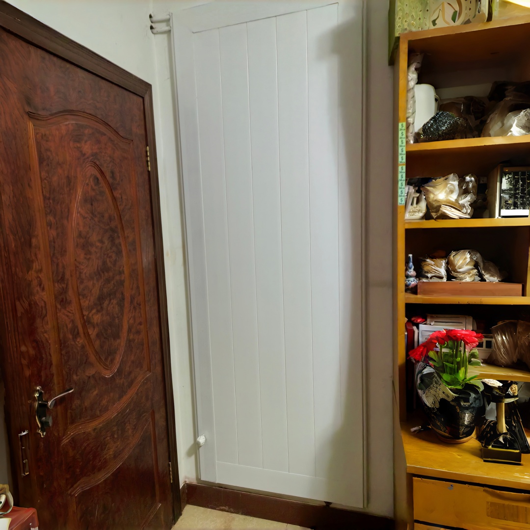 门后墙面宽度有限,但可纵向拓展安装高度,最高支持2.6米竖式安装。以5片2.6米高的标准款为例,总散热量可达2300瓦,足以满足20平方米房间的供暖需求;且5片散热片搭配左右装饰罩后,总宽度仅82厘米,与常规门体宽度相近,贴合门后空间尺寸,不突兀不拥挤。