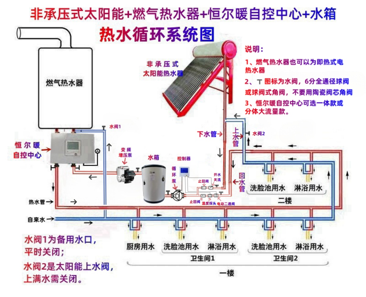一、非承压太阳能+燃气热水器+储能保温水箱+恒尔暖自控中心+自吸增压泵+循环泵+“循环+增压智能控制套件”的零冷水系统