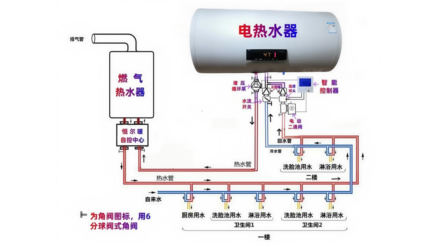 水箱的出水口利用管道与恒尔暖自控中心右下口对接,之前不要有用水点,自控中心左下口接热水主管口,依次经过各个用水点接出支管与水龙头连接,直到最后用水点继续向水箱处布置,这节管道就是回水管,然后与自来水管合并接入水箱入水口,这样就形成一个完整的热水循环系统。
