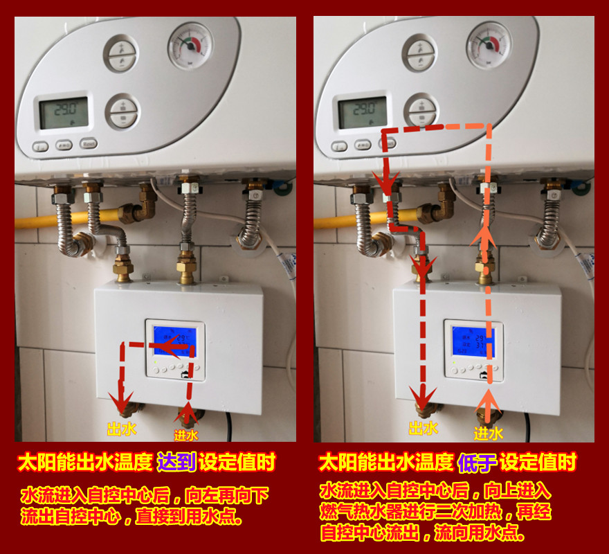 恒尔暖自控中心四个直接对接一下即可,右下口接太阳能/空气能水箱出水口,左下口接热水主管口,右上口接燃气热水器冷水入口,左上口接燃气热水器热水出口。